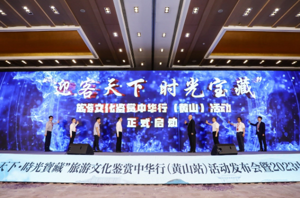 ??大會最后,八位嘉賓共同上臺按下啟動按鈕,宣布“迎客天下 時光寶藏——旅游文化鑒賞中華行(黃山)活動”正式啟動。
