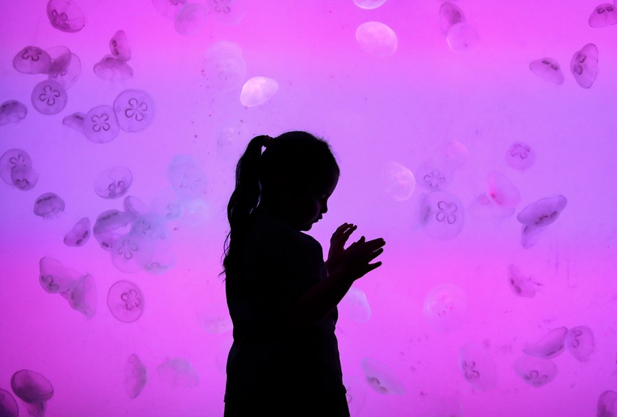 10月5日,小朋友在遼寧省沈陽海洋探索中心游覽。新華社記者 龍雷 攝