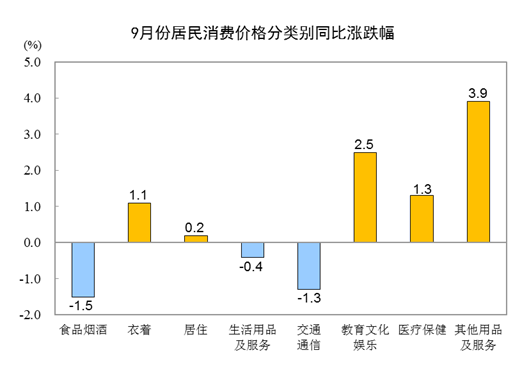 9月份,全國居民消費價格環(huán)比上漲0.2%。其中,城市上漲0.2%,農(nóng)村上漲0.3%;食品價格上漲0.3%,非食品價格上漲0.2%;消費品價格上漲0.4%,服務(wù)價格下降0.1%。