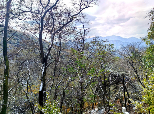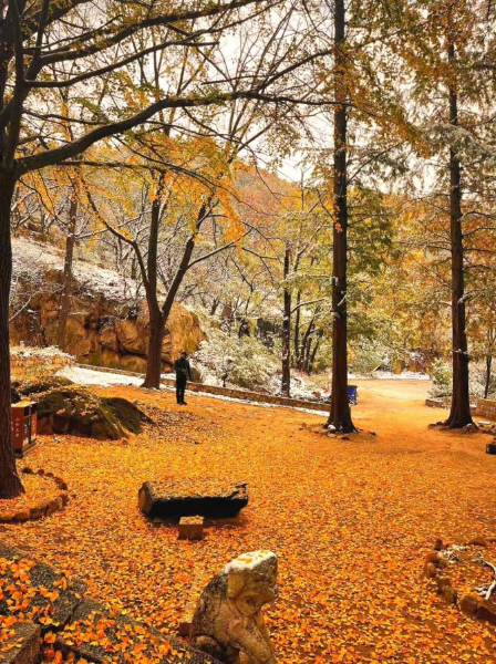 ??抬頭仰望,寒冬的銀杏葉與天穹并肩私語;側身細看,深秋的鎏金枝椏與瑞雪親密互動;低頭一瞧,細密的黃葉手牽手結成一片連綿的毯。半是秋景半是冬,杏黃與雪色之間,大澤山是第三種絕色。