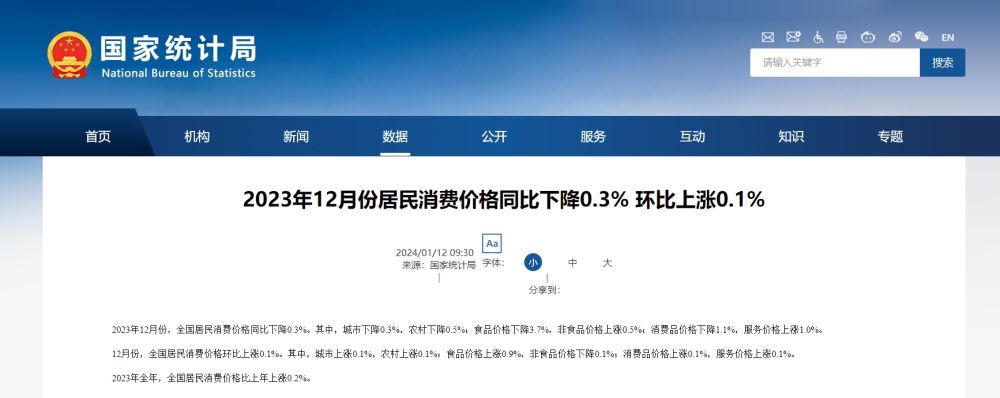 ??2023年12月份,全國居民消費價格同比下降0.3%。其中,城市下降0.3%,農村下降0.5%;食品價格下降3.7%,非食品價格上漲0.5%;消費品價格下降1.1%,服務價格上漲1.0%。