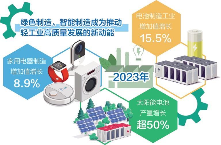 ??從行業(yè)來看,以太陽能電池、家用電器等為代表的輕工綠色制造、智能制造行業(yè)快速成長,成為推動輕工業(yè)高質(zhì)量發(fā)展的新動能。去年,太陽能電池、家用洗衣機、家用冷柜、電冰箱、空調(diào)等產(chǎn)品產(chǎn)量保持兩位數(shù)增長,其中太陽能電池產(chǎn)量增長超50%。電池制造工業(yè)增加值增長15.5%、家用電器制造增加值增長8.9%。