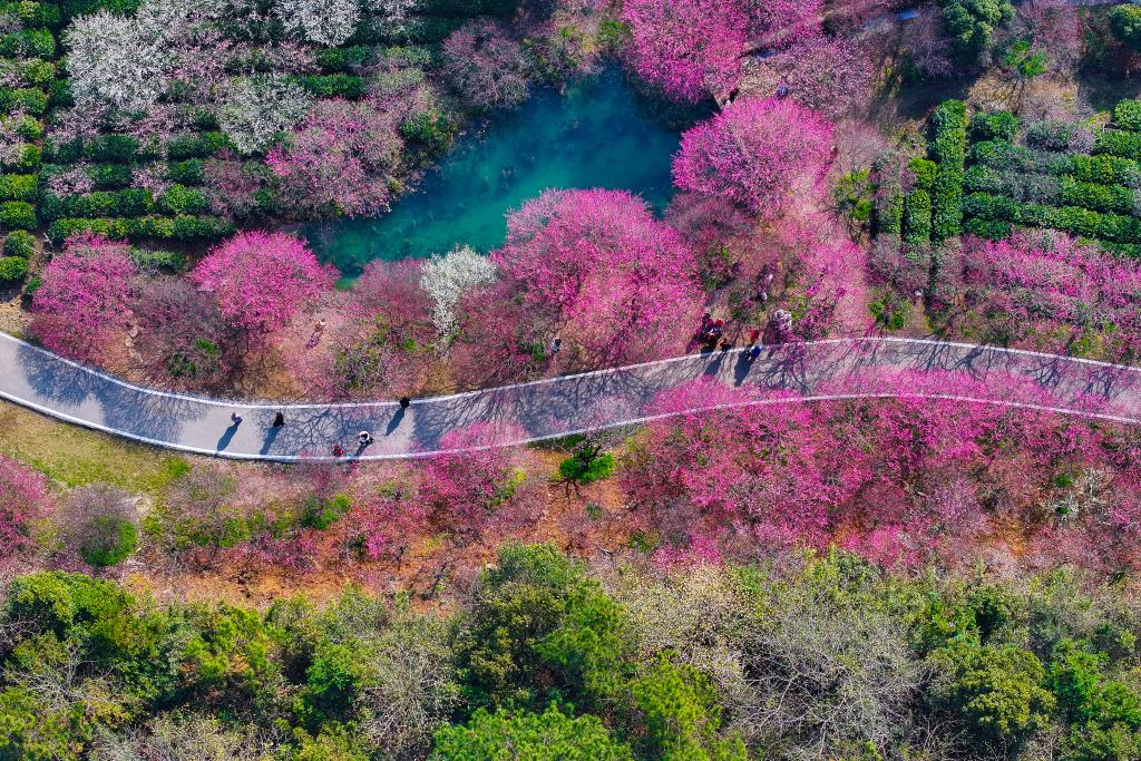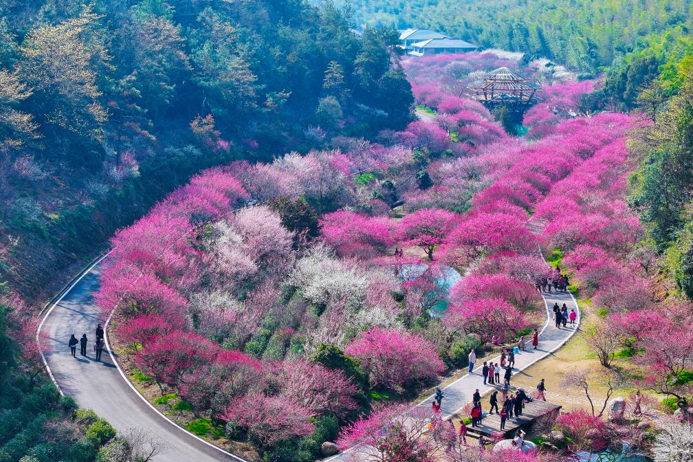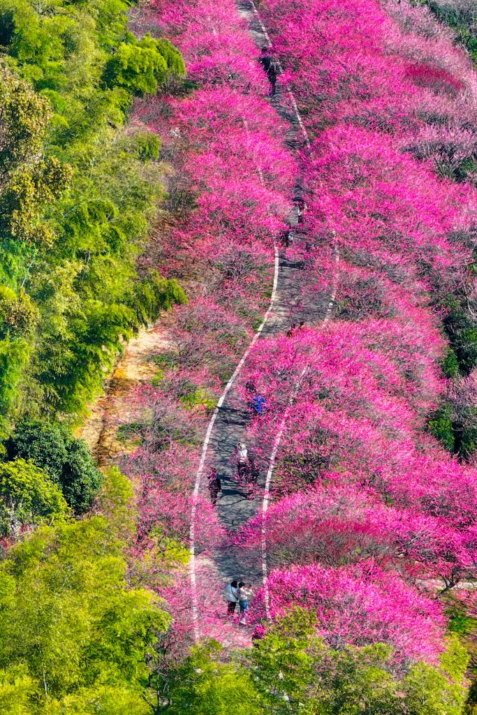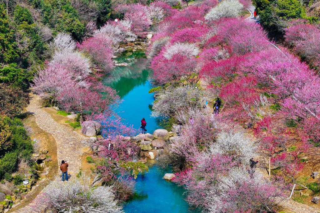 ?早春時節,浙江省湖州市長興縣龍山街道東方梅園內梅花競相綻放、姹紫嫣紅,一派春意盎然,吸引游客前來賞花游玩。