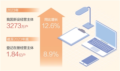 ??國家市場監(jiān)督管理總局日前發(fā)布數據顯示:2023年,我國新設經營主體3273萬戶,同比增長12.6%。其中,新設企業(yè)1002.9萬戶,增長15.6%;新設個體工商戶2258.2萬戶,增長11.4%。