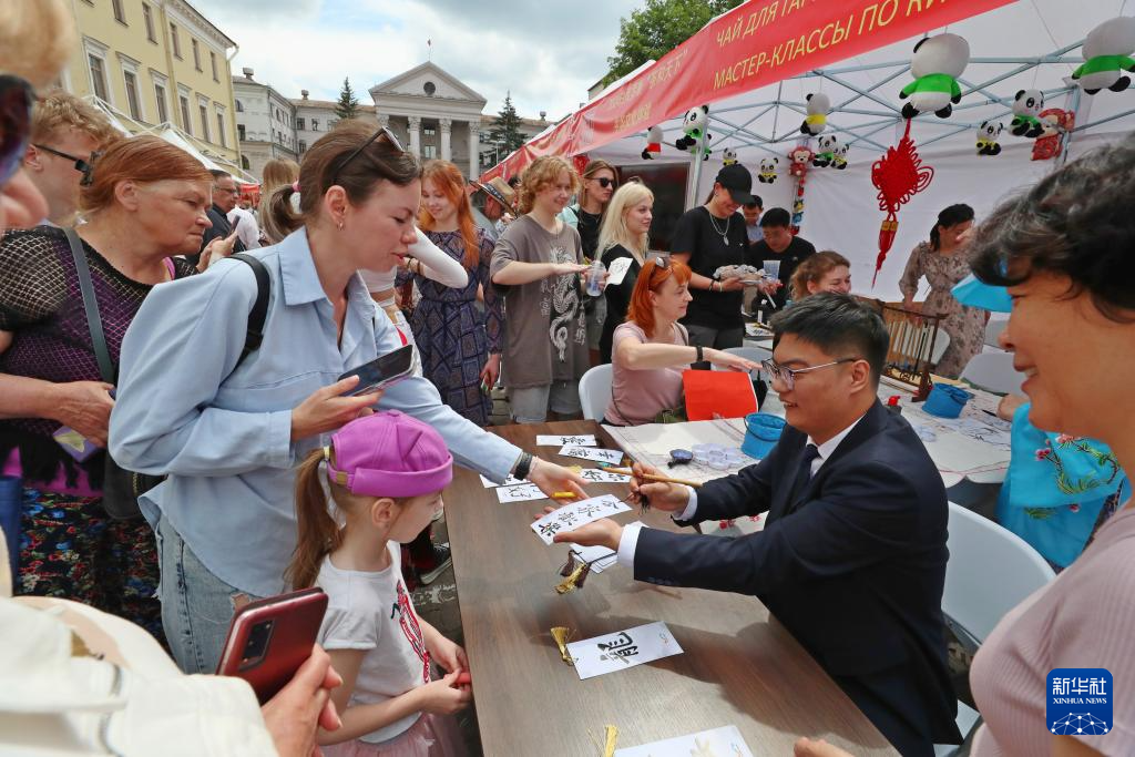 6月1日,人們在白俄羅斯明斯克“茶和天下·雅集”活動現場體驗漢字文化。