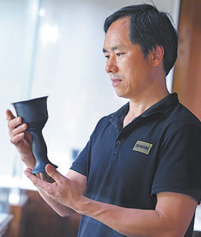 走進江西省靖安縣靖窯陶瓷展廳,古樸厚重的氣息撲面而來,展廳內陳列著各式瓶、罐,通體墨黑,散發著厚重溫潤的光彩。記者小心地拿起一個蛋殼黑陶高柄杯掂了掂,杯子看起來重,實際卻輕如薄紙。
