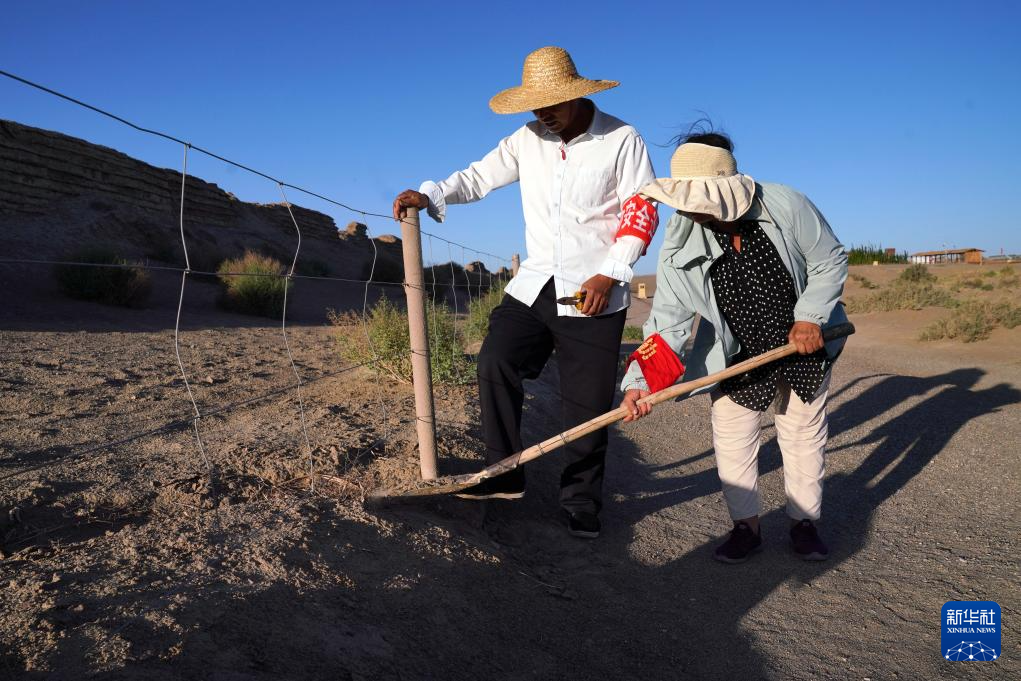 7月16日,張吉全和聞春瑜夫婦沿著漢長城巡護時加固防護欄。
