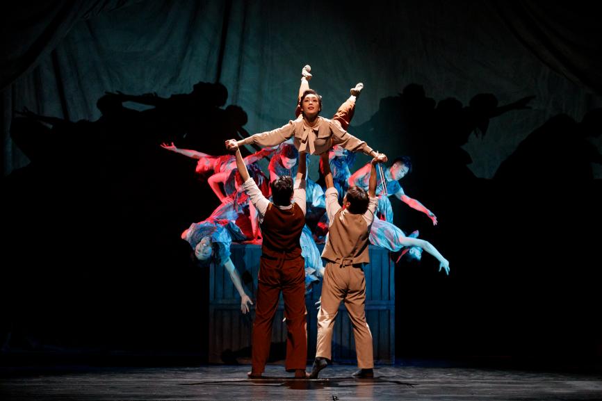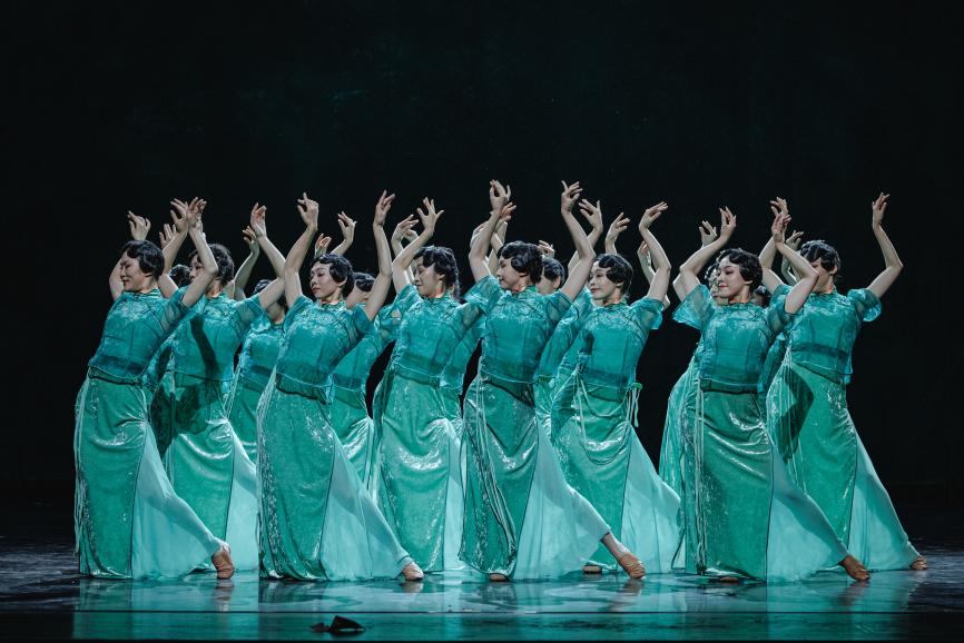 舞劇《熱血當歌》以20世紀30年代的上海為背景,講述了熱血青年田漢、聶耳、安娥在充滿動蕩的時代,用他們的才華和熱血為勞苦大眾發聲、為抗日救亡吶喊的故事。從《卡門》《四季歌》到《揚子江暴風雨》《義勇軍進行曲》,熟悉的旋律不斷響起,臺上的舞蹈演員們用藝術的方式,還原了三位年輕藝術家當時的創作場景,展現了他們的才華與理想。