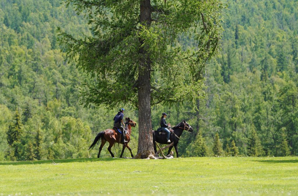 在新疆阿勒泰地區哈巴河縣,游客在騎馬。新華社記者 阿曼 攝