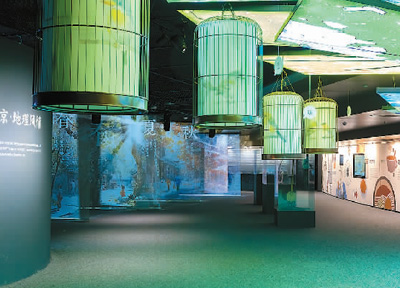展廳里用紗幕投影動態展示北京街道影像,把胡同小吃和時令節氣等人文主題童謠融合在四季光影里,讓觀眾身臨其境地感受老北京歌謠的繽紛多彩與胡同生活的溫馨親切。《劉伯溫造北京》《萬壽山》《魯班爺鋸白塔》《前門樓子高不高》《前門情思大碗茶》等體現城市記憶、市井商業的歌謠,配合著圖文互動大屏精彩呈現。一棵翠綠的“大樹”上掛著高低錯落的“鳥籠”,觀眾可在此重溫夏日樹下納涼的愜意,還可以將頭探入“鳥籠”中,欣賞金代《泰和年間童謠》、元代《腳驢斑斑》、明代《明正統京師童謠》等具有代表性的歷史童謠。