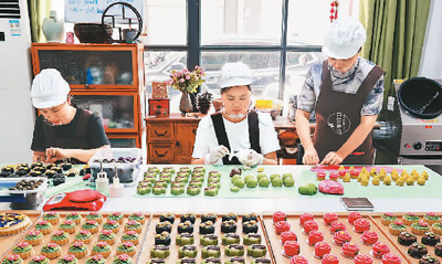 在浙江省金華市,非物質文化遺產“清明馃”代表性傳承人汪麗娟和工作人員正在趕制純手工“國潮”月餅的中秋訂單。