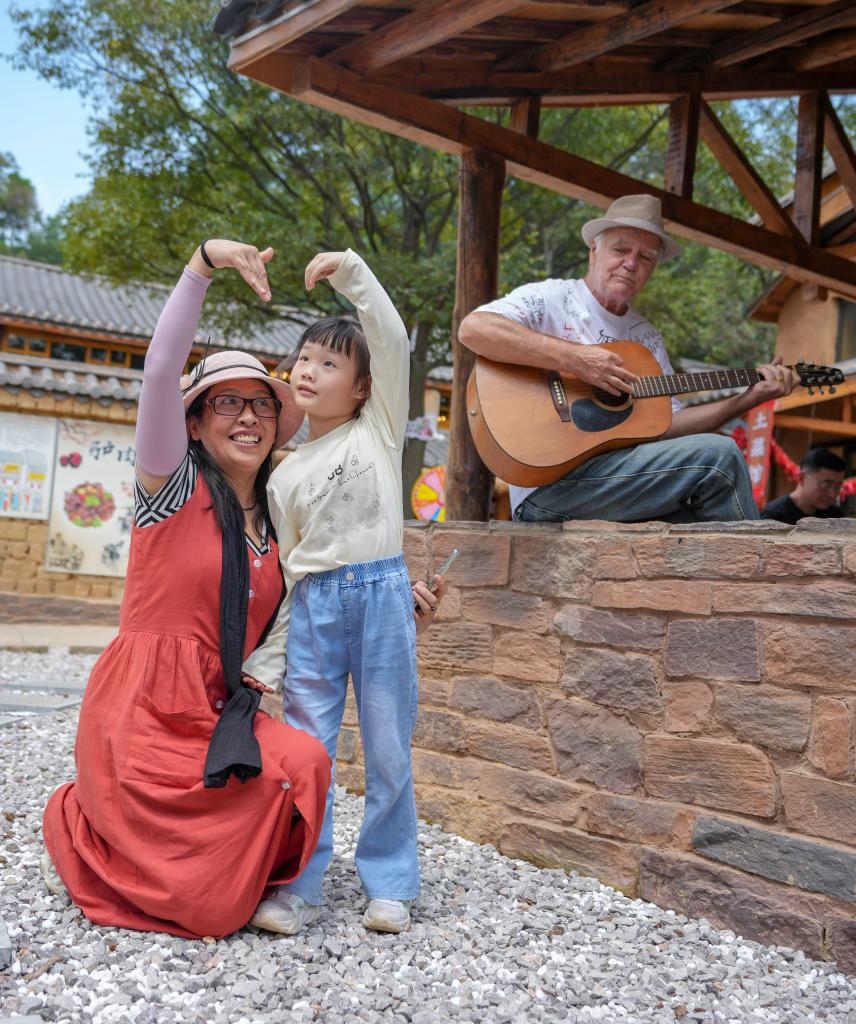 王伶(左)和一名小朋友在土瓜沖村合影,她的愛人在一旁彈吉他(9月15日攝)。新華社記者陳欣波 攝
