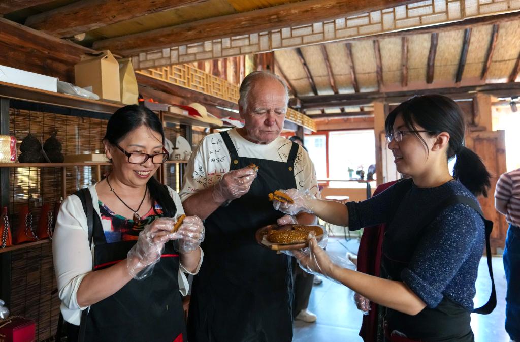 袁云(右)在自己的烘焙店內(nèi)向王伶(左)和她的愛人(中)分享店鋪制作的中秋月餅(9月15日攝)。新華社記者陳欣波 攝