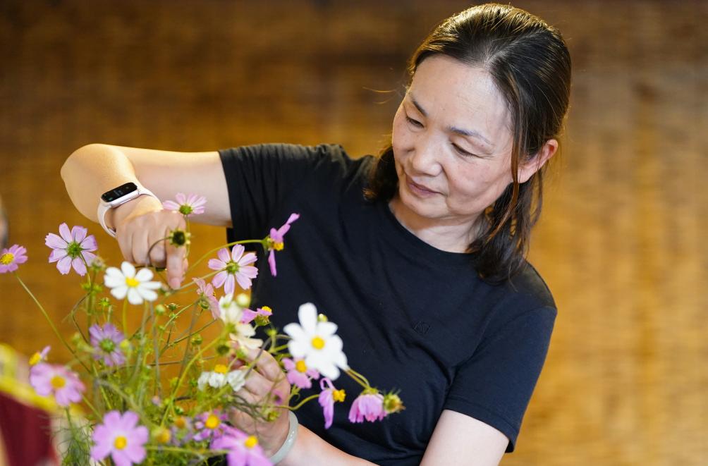 來自湖南的周女士在位于土瓜沖村的旅居房內(nèi)打理采摘的野花(9月15日攝)。新華社記者陳欣波 攝