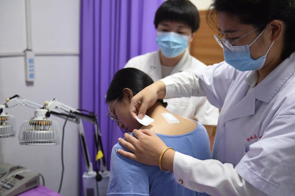 7月15日,山東省臨沂市郯城縣馬頭中心衛(wèi)生院國(guó)醫(yī)堂醫(yī)護(hù)人員在給市民貼“三伏貼”。新華社發(fā)(房德華攝)