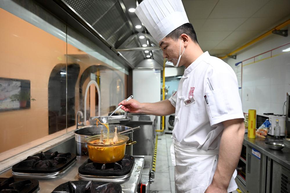 5月7日,在安徽省亳州市一家藥膳餐廳,藥膳制作師在制作藥膳。新華社記者黃博涵 攝