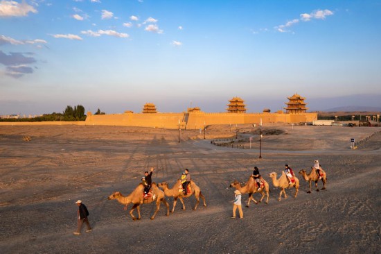 7月15日,游客在嘉峪關關城旁騎駱駝游覽(無人機照片)。新華社記者郎兵兵 攝