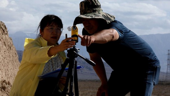 8月16日,嘉峪關絲路(長城)文化研究院長城保護研究所所長張斌(右)和同事在嘉峪關長城第二墩附近使用風速儀監測風速。新華社記者張智敏 攝