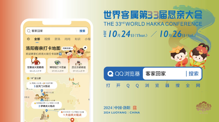 為了讓更多客家人參與大會,騰訊QQ瀏覽器推出“世客會火炬打卡地圖”和“全世界客家人回洛懇親打卡”活動,不能親臨現場的客親可通過三種方式線上“打卡回家”,云游洛陽。