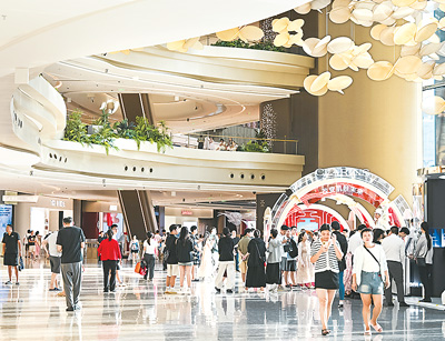 游客在cdf三亞國際免稅城C區全球美妝廣場游覽購物。