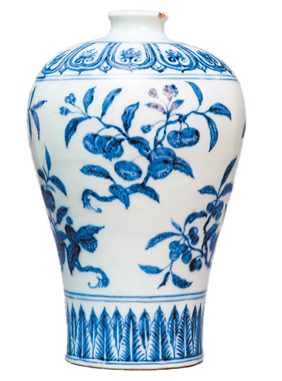 明永樂青花折枝花果紋瓷梅瓶。