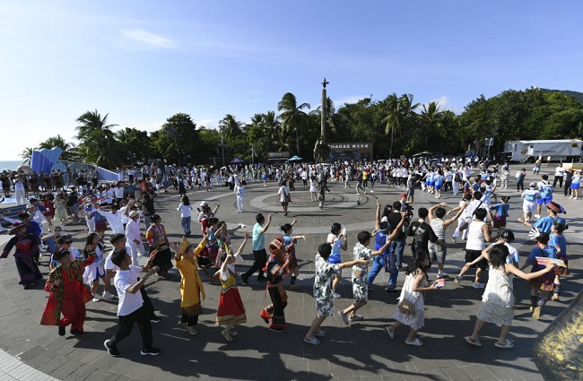 本屆運動會民族大聯歡活動分為歡迎儀式、游園環節、聯歡環節共三個部分。活動當天氣氛熱烈,到處都是歡歌笑語,其樂融融的場景。在天涯海角景區廣場,伴隨著《我們都是一家人》的樂曲響起,56個民族的運動員代表手拉手,跳起歡快的“圓圈舞”,展現中華民族一家親的和諧之美。聯歡晚會后,穿著民族特色服裝的青年男女不愿離去,他們圍聚在一起,自發起舞獻技,熱鬧歡騰。