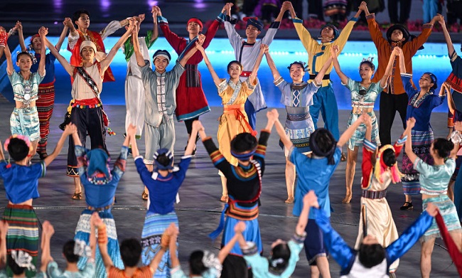 11月26日,第十二屆全國少數民族傳統體育運動會(以下簡稱“運動會”)按下競賽“暫停鍵”,切入到攜手游園、載歌載舞、共敘情誼的民族大聯歡活動中。56個民族的運動員代表,穿著絢麗多彩的民族服飾,手拉手心連心,唱響民族團結一家親。