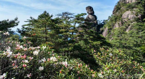 花與山的對話是云霧也遮不住的浪漫。杜鵑花從不獨美,它們偏要纏著三清山的奇峰怪石一起“撒野”。
