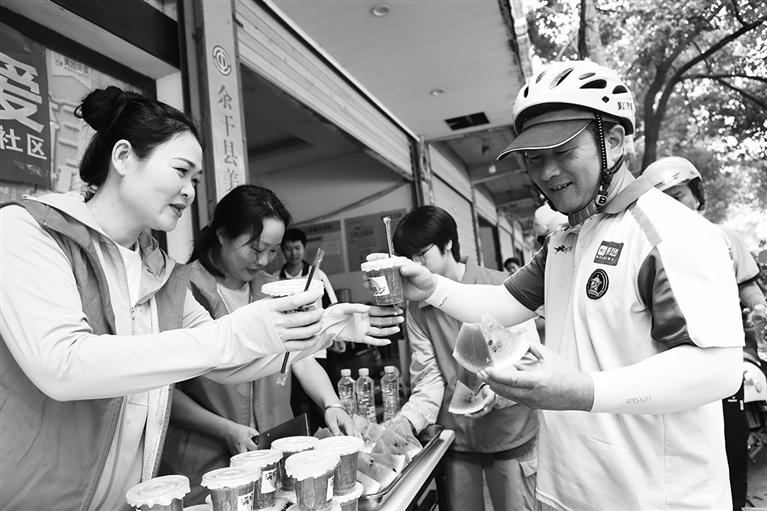 近期持續(xù)高溫,余干縣各地志愿服務(wù)人員積極組織開展“夏日送清涼”活動,為一線勞動者們送上綠豆湯、西瓜、涼茶和降溫防暑用品等。韓海建 攝