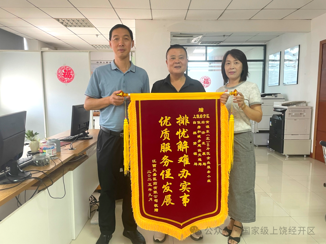“非常感謝你們的高效服務,為我們解決了多年來的難題,也讓我們企業發展更有信心了。”9月25日,江西天盛醫藥有限公司負責人來到上饒經開區,鄭重地將一面印有“排憂解難辦實事,優質服務促發展”的錦旗送到了區經發局、住建交局、自然資源局和片區企業服務小組干部的手中。