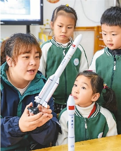 4月23日,安徽省馬鞍山市含山縣一幼兒園開展航天科普教育活動,幫孩子們感受科技魅力,點燃科技夢想。圖為老師在向小朋友們介紹中國火箭航天模型。