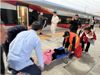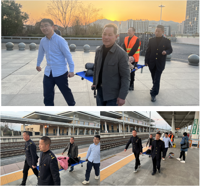 “怎么了這是?需要搭把手嗎?”2024年2月14日,客運值班員周就沁巡視站區時,看到一行旅客大大小小六七人在落客平臺面露難色,便上前詢問是否需要幫助,打聽一番了解到,該行旅客系一家六口來玉山探親,其中張女士在探親期間不慎尾椎骨骨折,致使無法正常行走、坐臥,來站路上都勉強堅持,現準備進站,但攜帶行李較多還有兩位小朋友,正在犯難怎么順利進站上車。“沒事沒事,辦法總比困難多,咱有擔架,可以躺著舒服地進站上車。”周就沁笑意盈盈地說道,說著便電臺呼叫客運員吳國林、潘建富攜帶擔架趕往落客平臺,協助張女士進站。“長這么大還沒有體驗過這種待遇,原來只知道鐵路有輪椅服務,沒想到還有擔架,現在鐵路服務是越來越好了,想的真周到!”