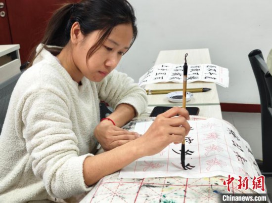 4月3日,在北京華文學院參加中文學習班的泰國學員吳嘉莉正在練習書法。(中新網記者韓輝 攝)