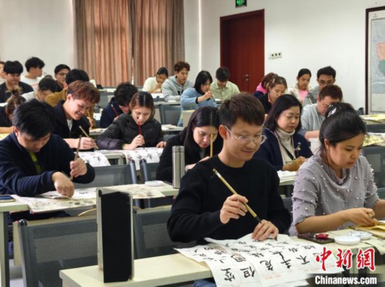 4月3日,在北京華文學院學習的泰國學員在上書法課。(中新網記者韓輝 攝)