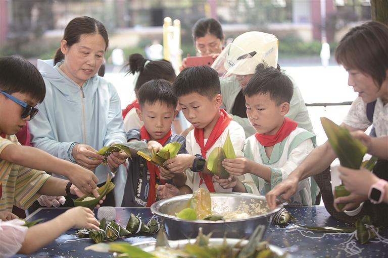 折粽葉、填糯米、纏葉子、系線……5月29日,橫峰縣第一小學邀請家長和師生一起包粽子,共迎“六一”國際兒童節和端午佳節。