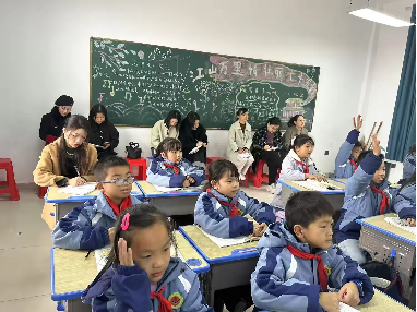 該校小學語文組教師林峰執教公開課《狐假虎威》。這則經典寓言故事出自《戰國策》,林老師以猜謎語的方式引入課堂,激發了學生們的學習興趣。在教學過程中,林老師設計了集中識字、隨文識字及多種體驗朗讀鞏固識字等環節,通過示范寫字來落實低年級語文學科素養。