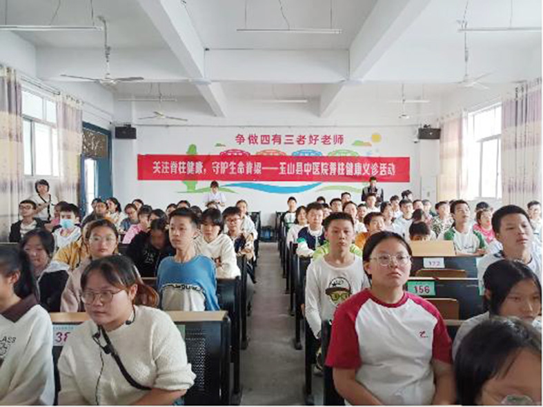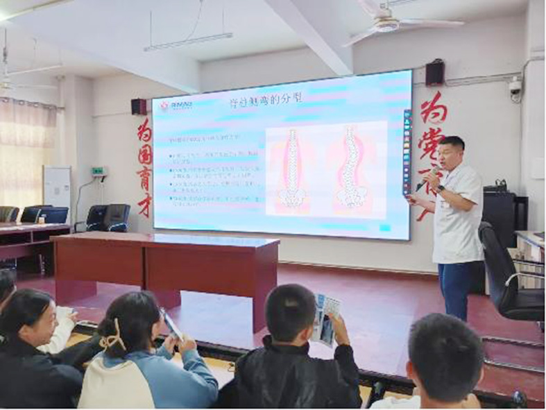 活動中,玉山縣中醫院康復科方徐軍以《脊柱側彎的評估與治療》為題,詳細介紹了脊柱側彎的定義、危害及預防措施。他指出,脊柱側彎已成為危害我國兒童青少年健康的第三大疾病,青少年發育期是脊柱側彎的高發期,占比高達8%左右,且隨年齡增長呈上升趨勢。因此,“早發現、早預防、早治療”成為了兒童青少年脊柱側彎防控的共識。該院影像中心主任劉小平及醫務人員為現場學生進行了義診篩查,通過對學生靜態姿勢的檢查,篩查出存在脊柱彎曲的學生,并建議有脊柱側彎傾向的同學及時就醫,采取中西醫結合方式改善脊柱側彎。