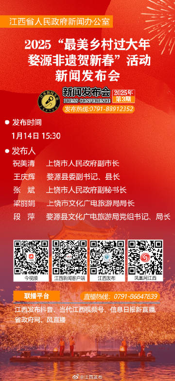 1月14日15時30分我省將舉行2025“最美鄉村過大年 婺源非遺賀新春”活動新聞發布會。 江西省人民政府新聞辦公室將于1月14日15時30分,在省政府新聞辦新聞發布廳舉行2025“最美鄉村過大年 婺源非遺賀新春”活動新聞發布會。 本次發布會將邀請上饒市人民政府副市長祝美清發布和介紹有關情況。婺源縣委副書記、縣長王慶輝,上饒市人民政府副秘書長張斌,上饒市文化廣電旅游局局長梁麗娟,婺源縣文化廣電旅游局黨組書記、局長段萍出席發布會,并答記者問。