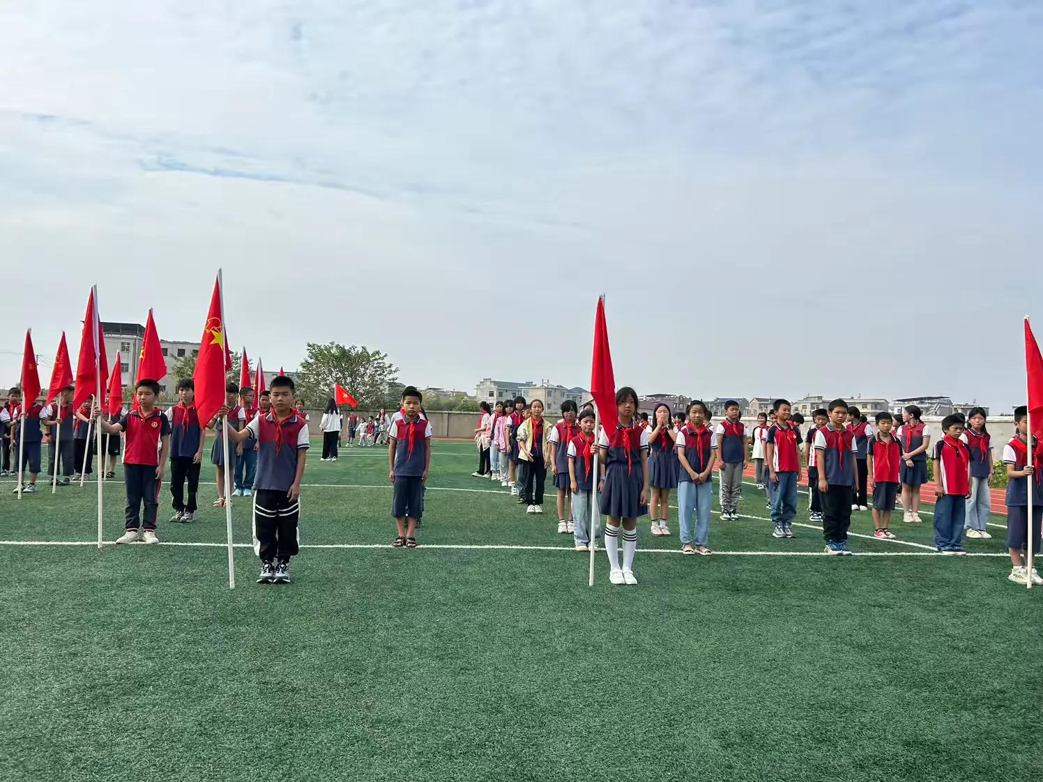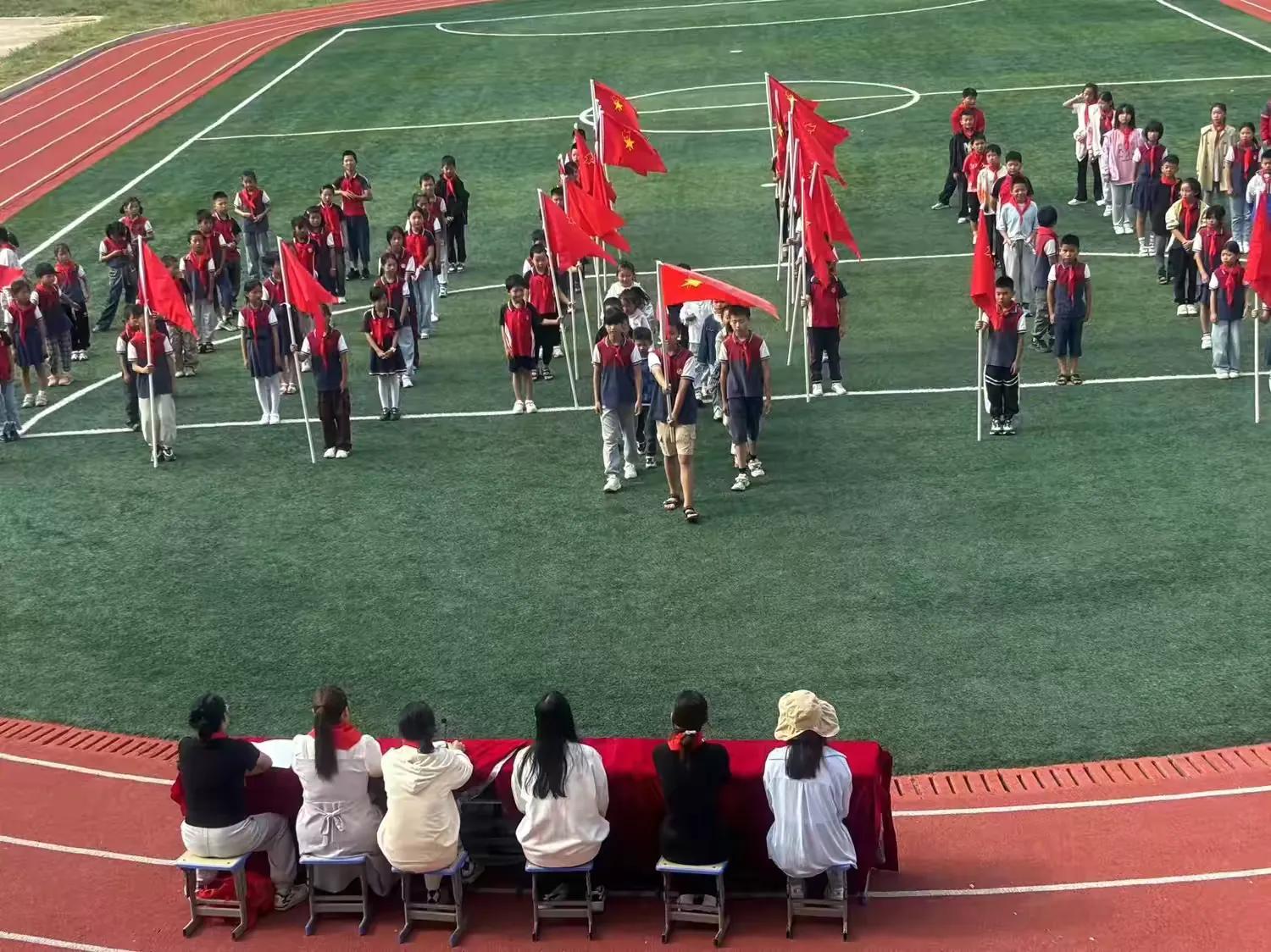 儀式在莊嚴的升旗儀式中拉開序幕。少先隊旗手與護旗手邁著整齊步伐出旗,伴隨著激昂的國歌,五星紅旗冉冉升起,全體師生莊嚴肅立,高唱國歌,愛國之情在心中激蕩。隨后,學校宣讀新隊員名單。紅領巾作為紅旗一角,承載著先烈期望與信念,在儀式中具有特殊意義。新隊員們伴隨著隊歌有序入場,稚嫩的臉上洋溢著開心與自豪。佩戴紅領巾環節,老師們、老隊員鄭重地為新隊員系上紅領巾,新隊員們回敬標準隊禮,鮮艷的紅領巾在胸前飄揚,象征著責任與光榮的傳遞。在飄揚的國旗下、鮮艷的隊旗前,少先隊輔導員帶領新隊員莊嚴宣誓,鏗鏘有力的誓言響徹校園。儀式最后,校長進行隊旗交接并致辭。她鼓勵隊員們樹立遠大理想,在學習中增長知識,以實際行動為隊旗爭輝、為國旗添彩。