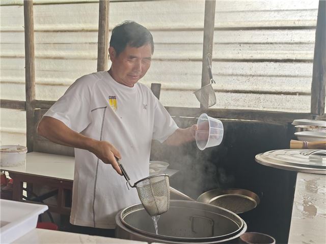吳漢常的燙粉攤始于2001年。此前,他在鄉(xiāng)政府承包食堂十余年,積累了烹飪經(jīng)驗。偶然間,他發(fā)現(xiàn)鄉(xiāng)親們對鉛山燙粉的懷念,卻因手藝流失難尋正宗味道。沒有師傅帶,他就自己研究。每天凌晨三四點起床,反復(fù)試驗湯底配方,嘗試不同米質(zhì)的米粉。半年后,他終于熬出了一鍋“骨香濃郁、湯清不渾”的湯底,米粉也做到“爽滑筋道”。
