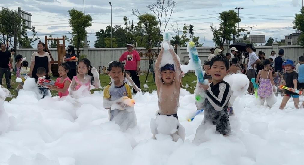 在泡沫互動環節,孩子們開展趣味游戲。他們或躺臥在綿軟的泡沫中感受清涼,或追逐飄散的泡泡展開童趣比拼,水花與泡沫交織的歡樂場景,被家長們用鏡頭定格為珍貴的成長記憶。