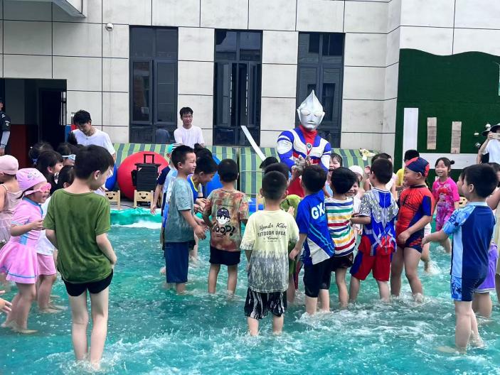 孩子們迫不及待地開啟這場清涼之旅。隨著動感音樂響起,奧特曼哥哥閃亮登場與小朋友一起互動,同時大大的泡沫機全力運作著,泡沫瞬間鋪滿整個場地,營造出一個夢幻的童話世界。小朋友們興奮地在泡沫中奔跑、嬉戲,有的用手捧起泡沫,感受其柔軟觸感。有的躺在泡沫里,愜意享受這份清涼。還有的小朋友打起了激烈的水槍大戰,你來我往,水花四濺,歡笑聲、尖叫聲回蕩在幼兒園的每一個角落。