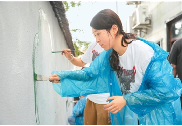 在浙江省湖州市德清縣舞陽街道上柏村,來自華東理工大學(xué)藝術(shù)設(shè)計(jì)與傳媒學(xué)院暑期研學(xué)團(tuán)的學(xué)生正在手繪創(chuàng)意墻畫,扮靚鄉(xiāng)村環(huán)境。