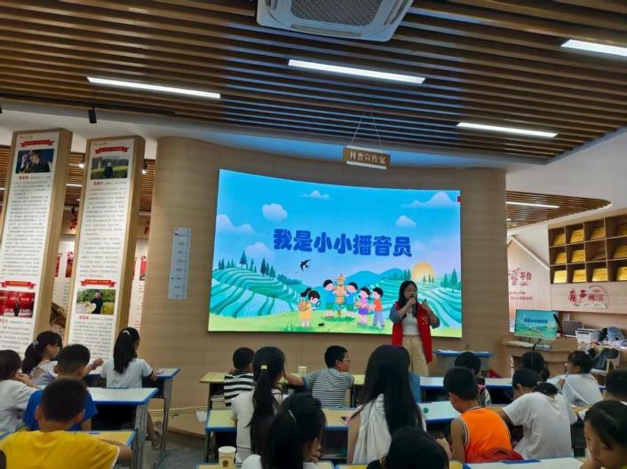 初體驗第二節播音課上,志愿者吳紫怡老師化身“聲音導師”,從普通話發音正音開始,通過“咬蘋果”趣味練習打開口腔,引導孩子們感受氣息共鳴。“大家好,這里是暑托班廣播站!”在模擬演播環節,學生們輪流體驗新聞播報,學習“微笑提顴肌”“重音表意群”等實用技巧。老師還揭秘廣播背后的故事:“播音員不僅要字正腔圓,更要用聲音傳遞溫暖。”孩子們對著話筒朗誦童謠,稚嫩而認真的聲音在教室回蕩,播下了語言藝術的種子。