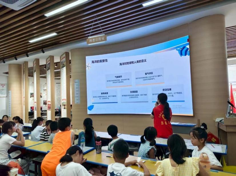 首節“人類與海洋”課上,志愿者凌美怡老師以震撼的海洋紀錄片開場,帶領孩子們認識這片覆蓋地球71%的蔚藍世界。通過互動地圖,學生們首次了解太平洋的廣袤、珊瑚礁的絢麗以及深海生物的奇特。“海洋是地球的空調機!”老師用生動比喻解釋海洋調節氣候的功能,并通過漁獲實物展示講述“海洋糧倉”的意義。當討論海洋污染議題時,孩子們承諾:“再也不亂扔垃圾,要保護大海!”課堂將科普與環保意識深度融合,在幼小心靈刻下藍色家園的印記。