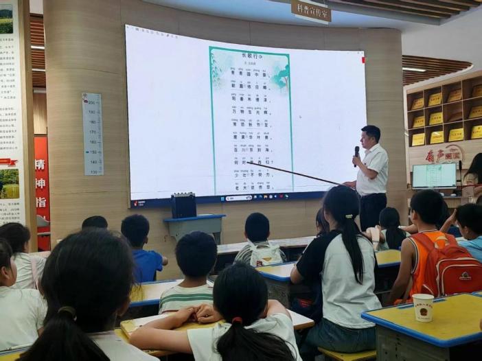 課程高潮落在古樂府《長歌行》的集體朗誦。師生們齊誦“百川東到海,何時復西歸”,稚嫩而莊重的聲音在教室回蕩。老師以飄落的梧桐葉為喻:“秋天是收獲的季節(jié),但若春天不播種,秋日只會徒留遺憾。”孩子們凝視著投影中奔騰的江河動畫,輕聲討論“時間像河水一樣流走了就不能回頭”。