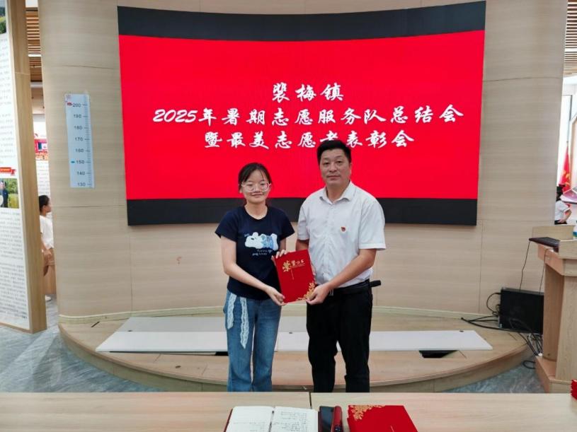 會議最后,9名志愿者獲頒裴梅鎮暑期“最美志愿者”榮譽證書。紅色封皮映照著青春面龐,兩個月的汗水凝聚成莊重表彰。這份榮譽不僅是對過往工作的肯定,更是青春力量與鄉村振興雙向奔赴的見證。