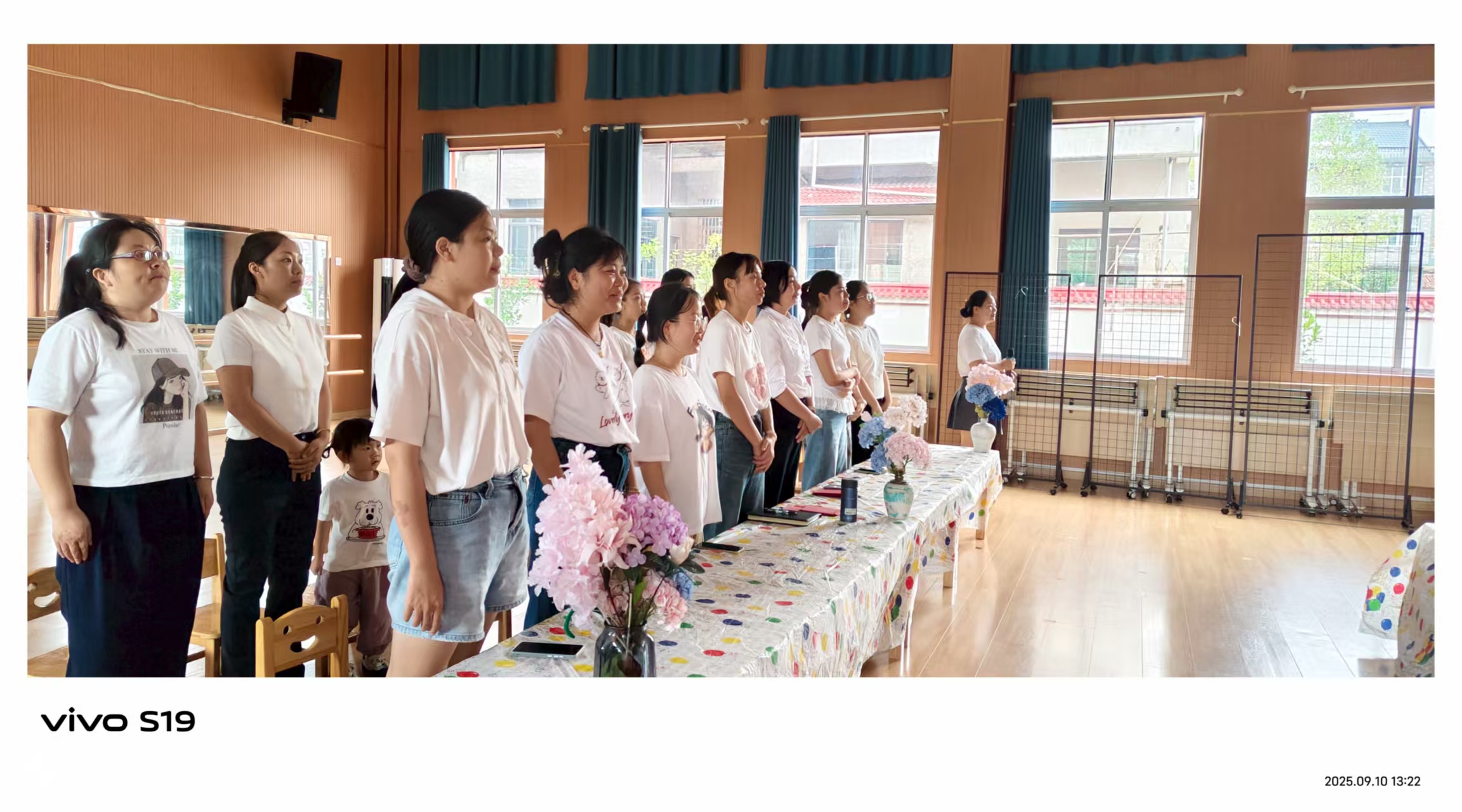 活動在莊重的氛圍中拉開序幕,全體教職工整齊站立,齊聲高唱國歌。園長首先向全體教職工致以節日的問候和感謝,肯定了大家在日常工作中的辛勤付出,提到教師們用愛心和耐心呵護幼兒成長,是孩子們成長路上的重要引路人。圍繞“教育家精神”解讀活動意義,回顧學校育人成果,向教師團隊提出“以教育家精神為指引,擔當教育強國建設使命”的期望。最后鼓勵大家繼續秉持教育初心,為幼兒園的發展貢獻力量。