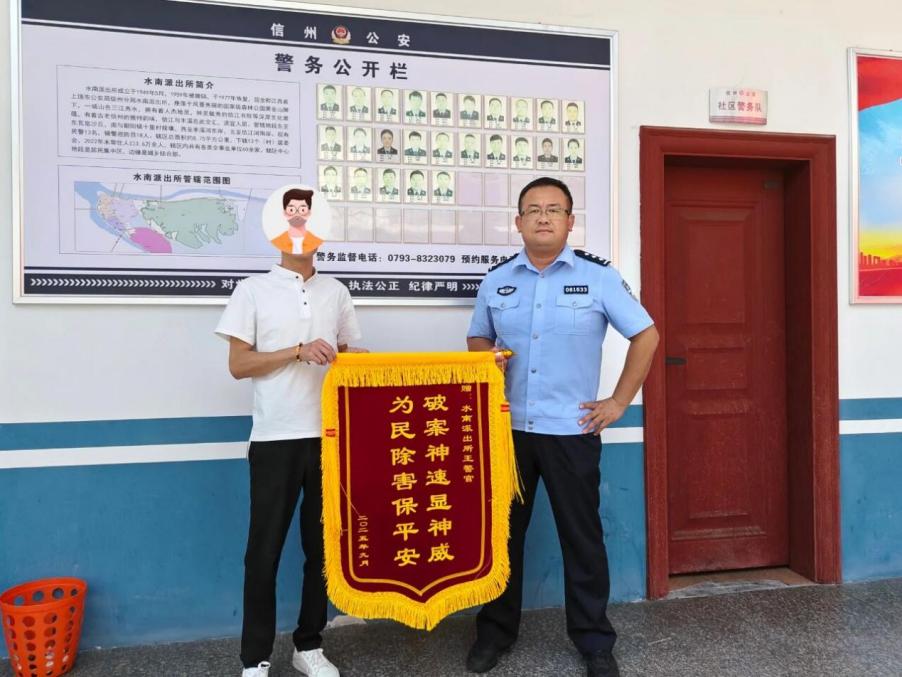 9月6日,為表達(dá)對水南派出所民警高效辦案效率和熱情服務(wù)態(tài)度的感激之情,陳先生特意制作了一面寫有“破案神速顯神威,為民除害保平安”的錦旗,送至水南派出所。“你們這辦案效率太快了!真的太感謝你們了,幫我及時追回了財物。”陳先生握著民警的手,激動地說道。