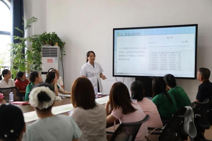 后勤副園長詳細(xì)解讀膳委會核心職責(zé),明確委員需在食材安全監(jiān)督、食譜制定參與、食堂衛(wèi)生檢查、關(guān)鍵環(huán)節(jié)公示見證等方面發(fā)揮作用,“希望與委員們緊密協(xié)作,把好幼兒飲食安全與營養(yǎng)均衡關(guān)”。黨支部書記、園長則以“全流程嚴(yán)把控”為核心,介紹幼兒園食堂管理細(xì)則:從食材采購的規(guī)范標(biāo)準(zhǔn)、入園前的嚴(yán)格檢驗,到食品加工的衛(wèi)生要求、留樣制度的規(guī)范執(zhí)行,再到常態(tài)化陪餐機(jī)制的落實,每一環(huán)均有明確標(biāo)準(zhǔn)與監(jiān)督措施。